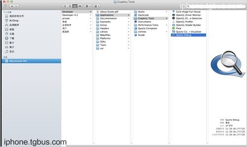 首先我們可以前往Mac App Store裡,免費下載Xcode4.2版本。安裝完成後,打開Developer》Applications》Graphics Tools目錄下的Quartz Debug工具。