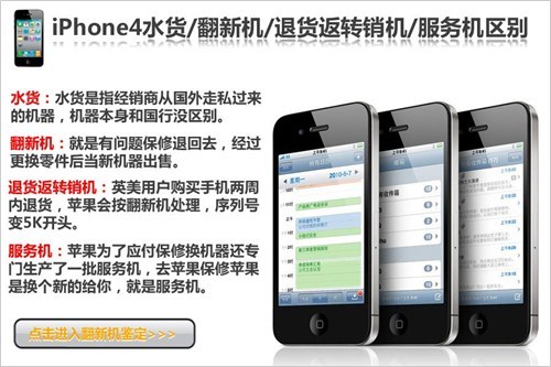 一般情況下,購買iPhone4的朋友可直接要求商家現場拆封,現場激活。但,未激活的iPhone4也只能在開機顯示USB接口和itunes的圖標,並不表示這個機子沒用過。如果你進入設置裡面也照樣可以把手機恢復到出廠時的狀態也就是未激活狀態,所以這個是無法判斷是否翻新。消費者在驗機過程中絕不能放松警惕。因此包括機子本身的外觀,有沒有屏幕入塵,機身外殼有沒有刮花等都是消費者在購買時應當注意的。