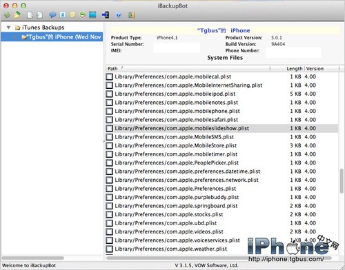 在iTunes備份完成後,打開iBackupBot軟件。iBackupBot會自動識別iOS設備的備份地址和文件。小編這裡使得的電腦只備份這一台設備的文件,如果你的電腦裡備份較多,注意根據備份時間選擇正確的備份。