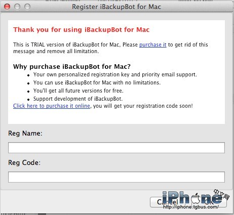 iBackupBot在打開文件前,會彈出一個要求軟件注冊的提示框,點擊取消進入下一步。