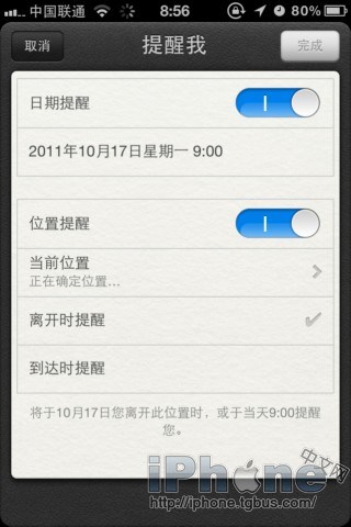 設置提醒方式,有兩種:日期提醒和位置提醒,為了以防萬一我兩個都要,先設置時間提醒這個簡單;然後設置位置提醒,比如:你現在在家裡,那可以設置當你離開家(當前位置)的時候提醒你,或者設置當你路過或到達某個地地方的時候提醒你。