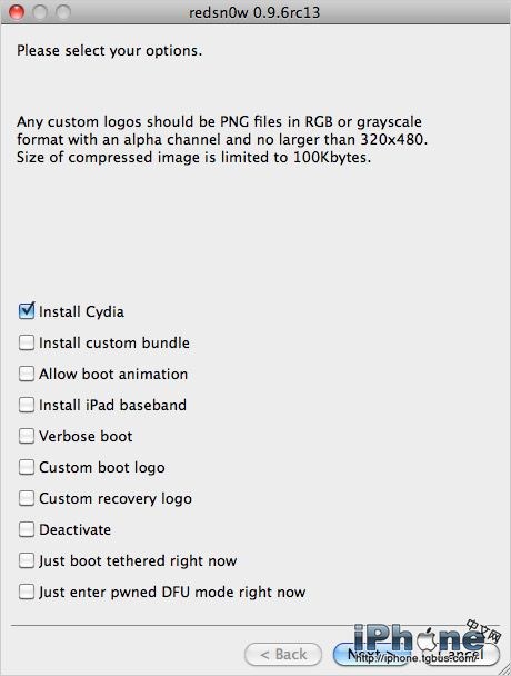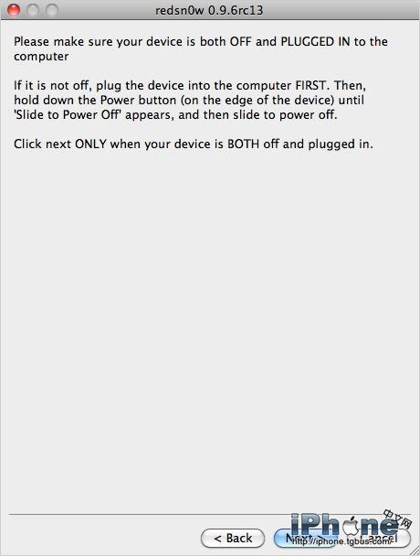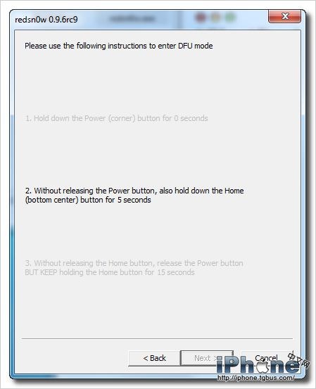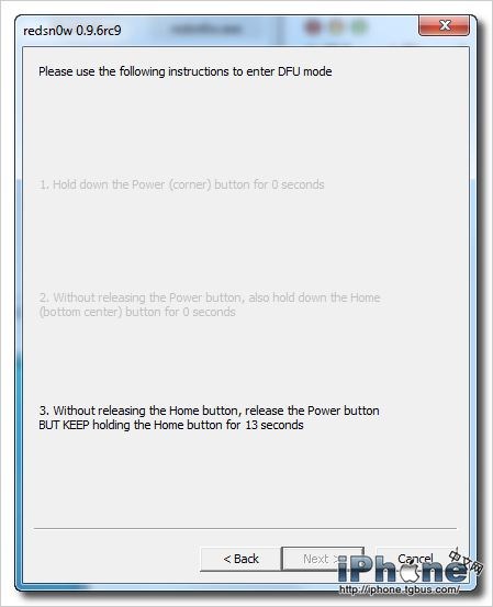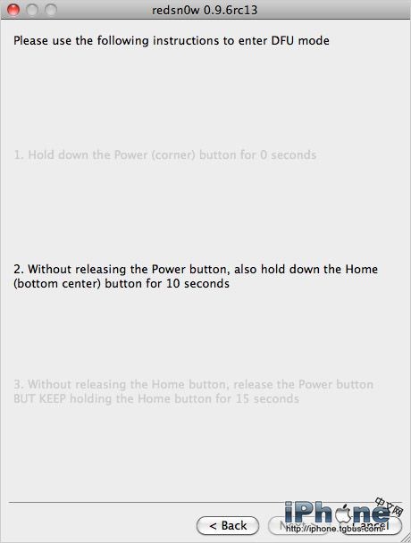 正確進入DFU模式後,屏幕一直為黑屏,這裡再操作redsn0w就可以瞬間跳過讀秒的提示界面了。