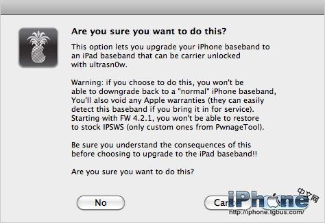 如果是3GS選擇升級iPad的06.15.00基帶,還會看到這樣的提示,如果升級,必須選擇Yes(有風險)