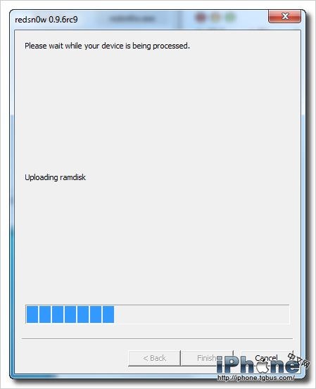 約30秒後可松開Home鍵,此時redsn0w開始對iPhone進行上傳和修補操作,此過程不要打斷。
