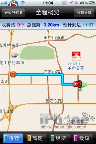 《高德導航》在計算完路線後在底部出現讓我們選擇的路線:“推薦”、“高速”、“經濟”、“最短”;一般我們選擇推薦的路線,如果你想先預覽路線讓心裡有的底可以點右上角“模擬導航”預覽一遍全程,想直接出發就點左上角的“開始導航”。