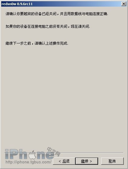 4、然後確保你的iOS設備已經關閉電源,並與電腦連接狀態正常,然後點擊下一步繼續。