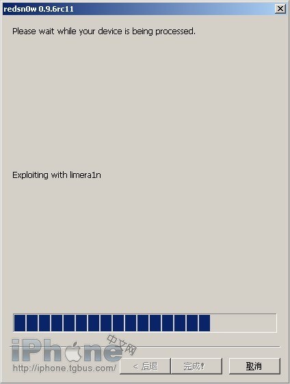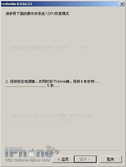 在這一過程中,用戶按照軟件上面的操作提示進入DFU模式:快速點擊電源鍵,然後在長按電源鍵的同時,也按住Home鍵,幾秒鐘後僅放開電源鍵,繼續按住Home鍵,就可以正常進入DFU模式。
