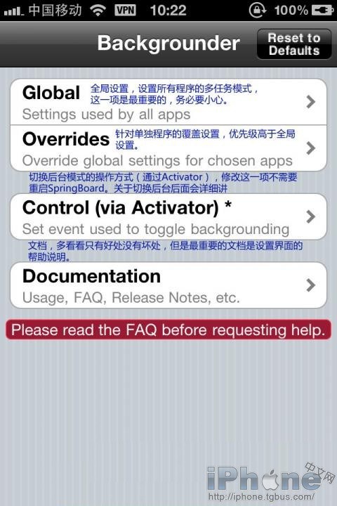 對於正確使用Backgrounder,最重要的就是對於iOS4原生後台模式的理解。這個問題Backgrounder自帶的說明就已經講得很清楚了。