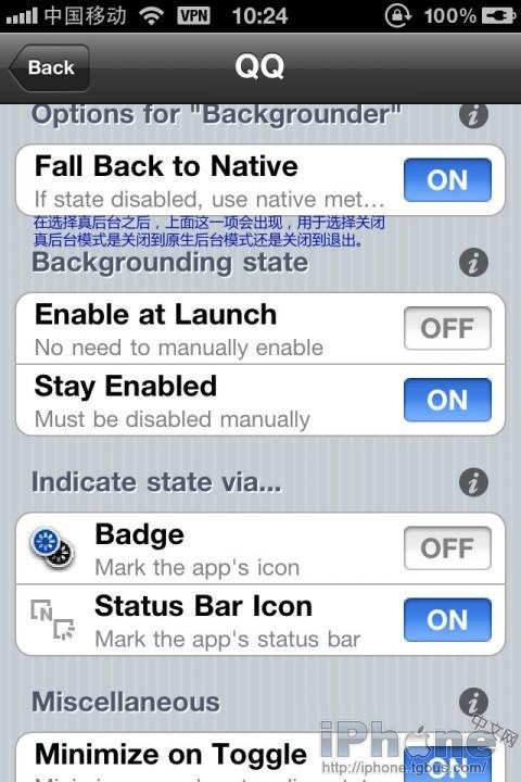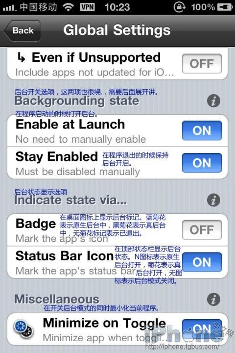 Stay Enabled表示是否要在程序最小化的時候保持後台開啟,這個選項相當蛋疼,因為如果不打開這一項,不管你在程序運行的時候切換到了什麼後台模式,一按Home鍵全部關閉。所以如果這一項關閉了,那麼Enable at Launch就沒有意義了,反正最小化的時候後台都得關閉。而且Minimize on Toggle關閉也沒有意義了,解釋起來實在費勁,你們懂的~~~這個選項需要關閉的唯一一種使用方式就是配合Enable at Launch關閉,Minimize on Toggle打開。在這種情況下,程序打開的時候後台總是關閉的,然後你短按Home鍵正常關閉程序,長按Home鍵(或者你自己設置的切換手勢)最小化程序到後台。如果你不是這種使用方式,那麼這一項應該一直保持打開。