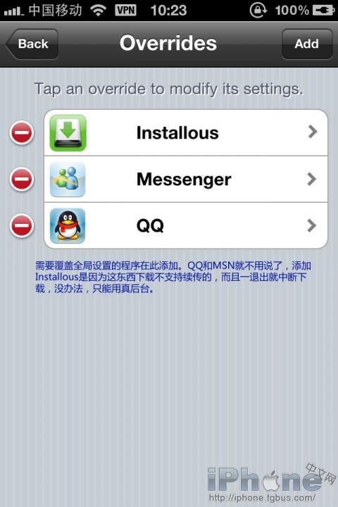 偏偏Backgrounder又是個對系統行為影響巨大的程序,個人感覺那些越獄之後大叫越獄費電厲害的一大半是因為這個程序。而Backgrounder的設置又是無比的繞,不仔細想想是不大能搞清楚的,這個程序的設置是需要思考的。所以小弟我認真做了個教程,希望能夠幫大家正確使用這個程序。所有的說明以iOS4為標准,更早的系統我沒有用過,沒辦法幫到大家。