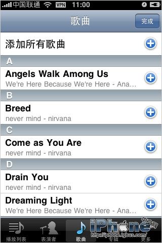 可以選擇添加iPod歌曲庫中你喜歡的音樂、專輯、表演者或添加所有歌曲