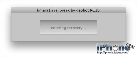 6.首先limera1n將iPhone置入恢復模式。注意,恢復模式不同於DFU,iPhone屏幕將顯示數據線和iTunes,而DFU模式iPhone則處於黑屏狀態。