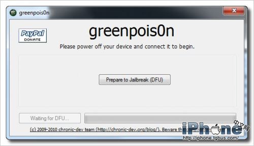 打開綠毒GreenPois0n RC3後,選擇Prepare to Jailbreak (DFU)選項