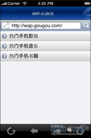 1.浏覽模式:iPhone版手機迅雷狗狗搜索首頁,提供了最熱門的手機音樂、書籍及影視。直接在輸入框中輸入您想搜索的關鍵詞,來搜索你想要的資源,也可以在輸入框中直接輸入地址來訪問您想要訪問的資源站點。