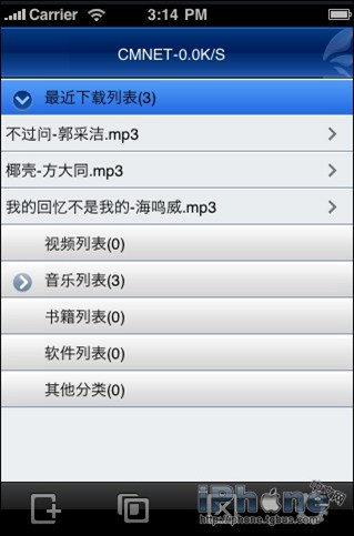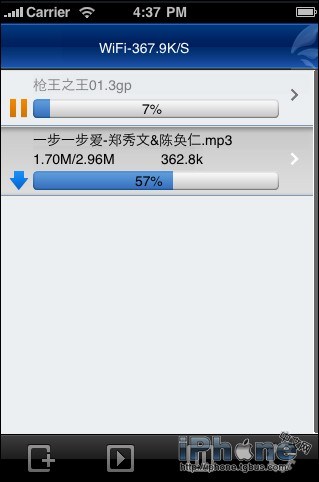 手機迅雷的iPhone版iThunder,迅雷公司出品,下載文件中,3.x可用於3、4代固件和iPhone,2.x可用於二代固件。