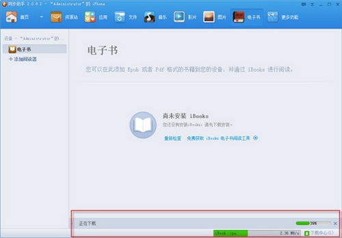 STEP1:啟動Windows版同步助手後切換到“電子書”頻道頁面。如果iPhone 5尚未安裝任何電子書閱讀器,將會提示先安裝。此時可按頁面提示點擊“免費獲取iBooks電子書閱讀工具”鏈接。