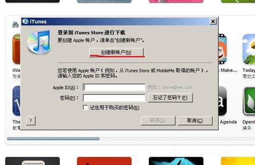 3、這時就會彈出一個提示iTunes Store注冊的窗口,點擊“創建新賬戶”。