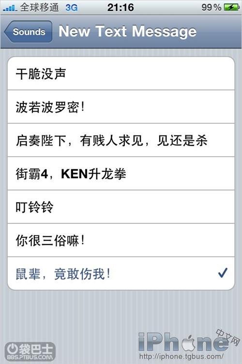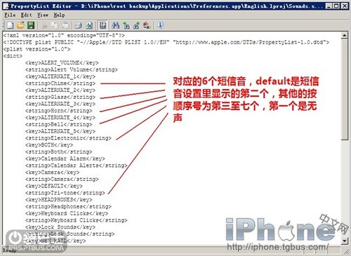 上面這堆麻煩的東西以後就省事了,短信鈴聲替換完畢後,直接iPhone上用ifile編輯Sounds.strings就可以了,因為現在的這個文件已經是xml樣式的,可以直接編輯。下面是我的短信音設置。