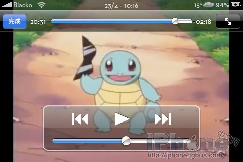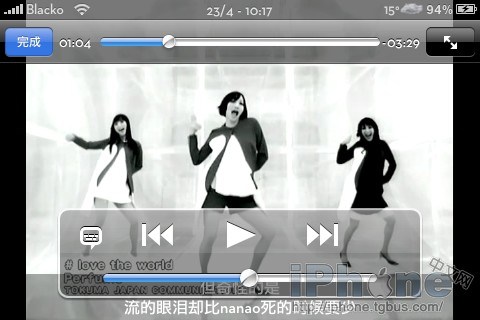 視頻轉碼有很多專門文章,這裡就不贅述了。我用企鵝(mac)和Winmenc(win)。值得一提的是,youtube、魔獸視頻等網站都支持將mp4文件直接下載,拷進iPhone就可以爽了。而國內常見的XviD,由於iPhone可以硬解碼之,用個小軟件將音頻從mp3轉換成aac,然後從avi打包成mp4,瞬間搞定,省去視頻轉碼的時間。(為了截圖示例,字幕是隨手加的電影srt,和MV視頻不匹配)