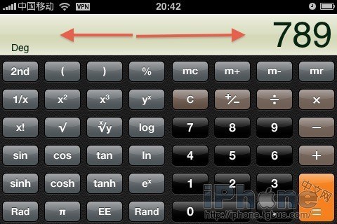 蘋果iPhone/iPod touch用戶注意到沒有,iPhone OS裡自帶的計算器,只有“C”鍵,也就是清除所有數字。如果你輸入了很長的數字,卻發現按錯了一位,就郁悶了。下面是蘋果iPhone、iPod touch自帶的計算器裡只刪除一位輸入數字的方法。