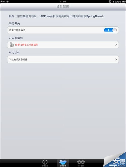 第二步:當你桌面出現iAPFree這個圖標後,啟動它,選擇插件管理,將啟用已安裝插件設為開啟狀態,然後選擇‘下載安裝更多插件’,將免費內購核心功能插件下載安裝上去。