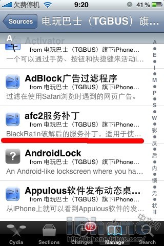 越獄後無法正常使用iFunbox看到系統目錄,不能正常連接91助手的用戶可以打開Cydia,在第一次整理硬盤(整理結束後會自動退出Cydia)後,再次打開Cydia。在Manage-Sources中點擊Add添加iPhone中文網軟件源http://iphone.tgbus.com/cydia/後,刷新並搜索到afc2補丁安裝,最後重啟即可解決此問題。