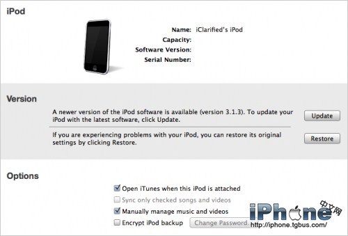 2.連接 iPod Touch 到電腦並連接 iTunes。在iTunes上點擊左側設備列表中的 iPod Touch,然後按住鍵盤上的Option(選項)同時點擊iTunes上的Restore(恢復)按鈕。恢復可以讓iPod touch恢復到最初始的狀態,以保證越獄的最佳效果。定位到3.1.3固件後,單擊該固件後再點擊Open(打開)按鈕繼續恢復固件操作。