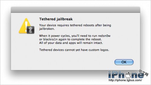 當軟件提示這是一個不完美越獄(tethered jailbreak )的時候,選擇OK繼續。否則將中止越獄進程。