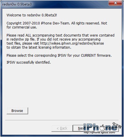 1.通過升/降級操作將iPhone固件升級或降級到3.0或3.1.2固件,因為目前redsn0w 0.9僅支持這兩種版本的固件。詳細辦法參見《iPhoneOS3.1降級3.0教程》,升級方法基本與降級一致,選擇固件時選擇3.1.2固件即可。