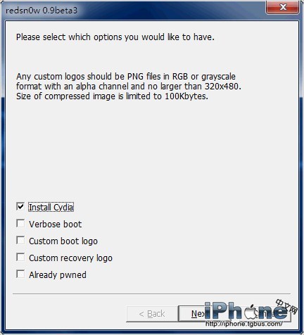 4.然後來到選擇安裝Cydia的畫面,在這個界面上,還可以定制開機的Logo、恢復畫面以及開機顯示命令行。
