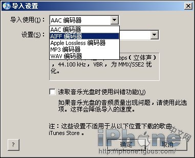 把“導入設置”裡面的“導入使用”修改為“AIFF編碼器”,點確定