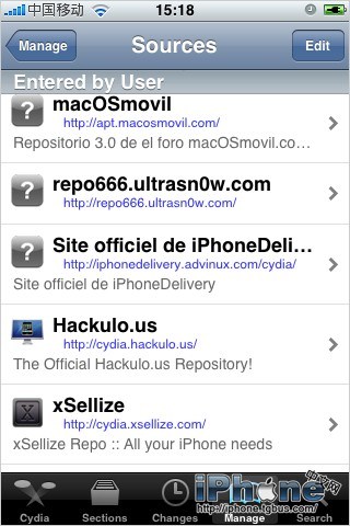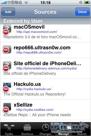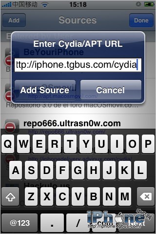 然後點擊左上角出現的Add,在彈出窗口中添加http://iphone.tgbus.com/cydia——即iPhone中文網3.x軟件源。
