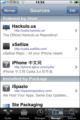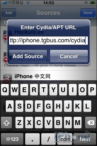 - 點“Edit” 然後“Add”,彈出窗口裡輸入“http://iphone.tgbus.com/cydia” 然後點擊“Add Source”。