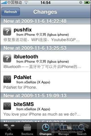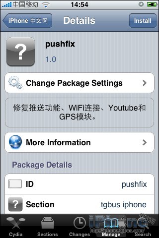 - 然後可以點擊右下角的Search來搜索“Push Fix”、點擊下方的Changes或重新回到Source頁面點擊剛剛添加的源iPhone.tgbus.com/cydia來找到並點擊這個軟件,然後點擊Install來安裝。