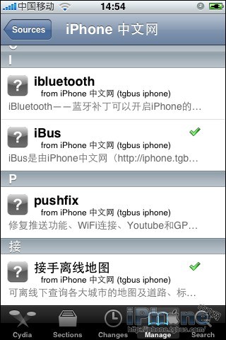 - 然後Cydia會開始一些自動下載和更新,中間不要關閉。更新好之後, 即可點擊右上角的Done來確認。這時Cydia的源列表裡已經出現“iPhone中文網”字樣。