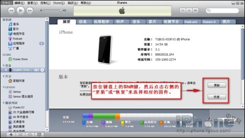 3、然後就可以按住鍵盤上的Shift並點擊“恢復”或“更新”來選擇固件了,需要說明一點,恢復開始時iPhone可能有一段時間的白屏幕,屬於正常現象,請用戶放心使用。