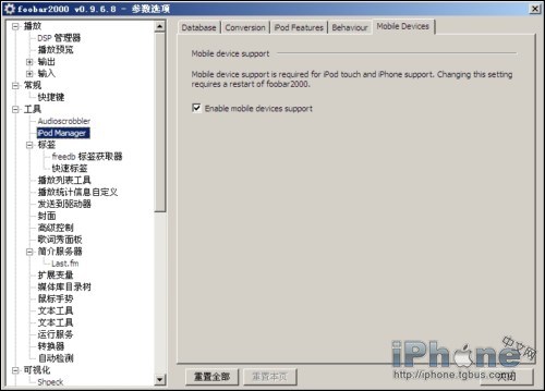 - 啟動foobar2000,發現文件選項下多了一個iPod選項。打開“文件—參數選項——工具——iPod Manager——MobileDevices”,勾選Enable mobile devices support 。如果您經常聽無損音頻,還可以把Conversion裡的Input兩個選項勾選,然後自定義轉換音頻的比特率。