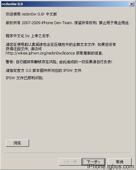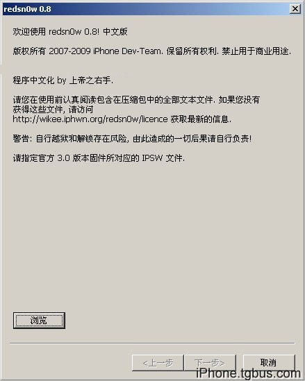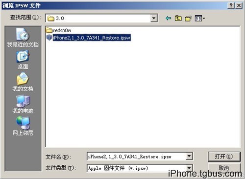 點“浏覽”選擇前面下載iPhone 3GS 3.0固件。