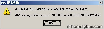 上圖,此步驟是進入DFU模式,如果你沒有正確進入會有下圖提示;實際上我們一般只需要進入恢復模式就滿足程序需要了。