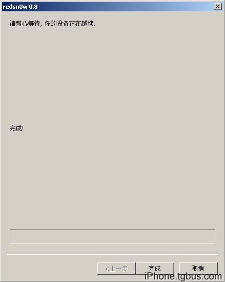 一旦全部完成redsn0w上將顯示done,點擊Finish關閉窗口,剩下過程在iPhone上自動完成大約需要5分鐘或更快。最後一次重啟完畢,在桌面上你將看見Cydia圖標。