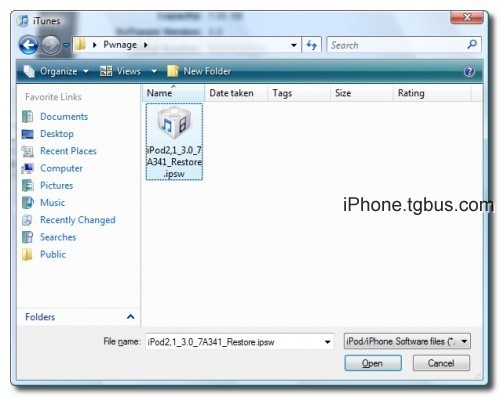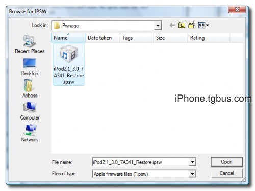 在iTunes下操作,按住鍵盤Shift的同時點恢復(restore)選擇之前下載的固件,進行恢復