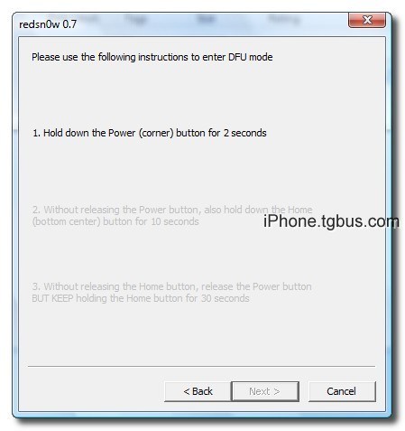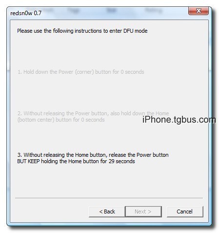 提示: 如果iPod Touch關機後再開機屏幕無任何顯示,即使電腦檢測到iPod Touch也無法識別(提示無法識別的USB設備),說明你的iPod Touch之前是使用老方法破解的,這時需要你摸黑操作,只能自己多嘗試幾次,進入DFU模式,才能讓電腦和iTunes識別。