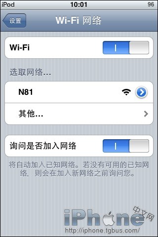 06、開始Touch上的操作,相對來說也很簡單。在設置WIFI裡,可以看到touch已經搜索到了N81。選擇N81網絡前,還需要個小小的設置。先點右面的藍色小箭頭,進行設置。