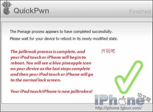 QuickPwn運行結束。等待TOUCH上面菠蘿運行完畢。