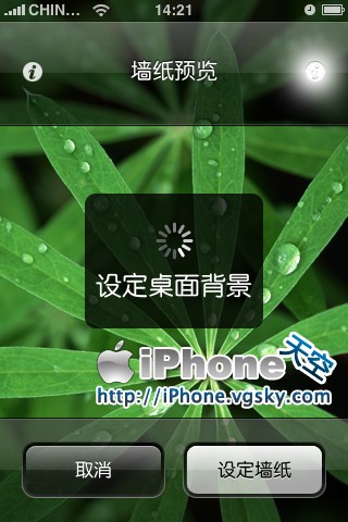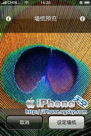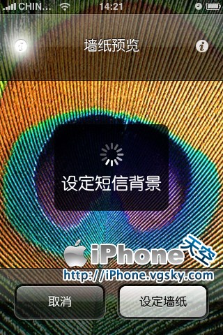 進入-設置-牆紙, 選擇一張牆紙,這時候你就可以在牆紙選項裡面選擇把該圖片設置為短信背景或者桌面背景了。 非常簡單吧。既不用裝Winterboard,又達到了目的。