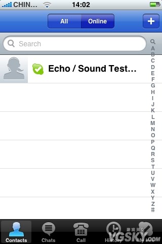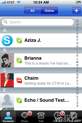 進入軟件後,可以看到頁面設計十分契合蘋果的風格,Skype盡量讓主題符合iPhone的招牌樣式。在聯系人界面中,我們可以用字母來篩選朋友,或者依照哪些人在線來排序。