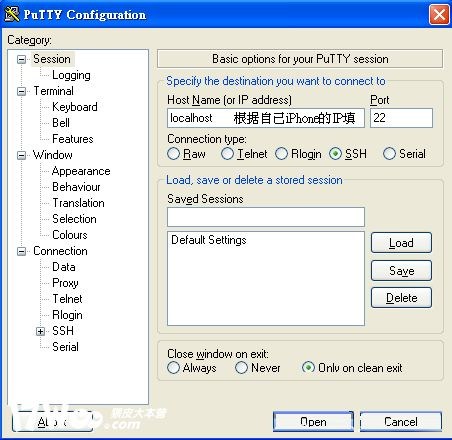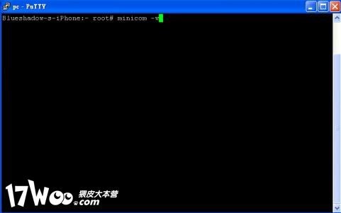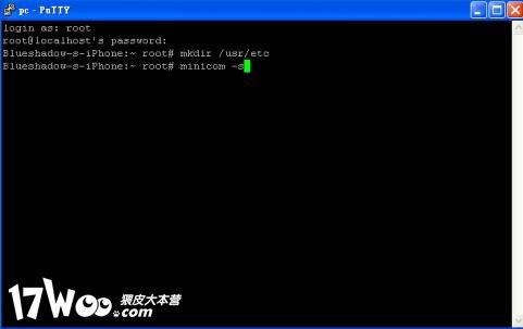 1. 從Cydia下載minicom,並於/usr建立etc文件夾(如果原本沒有的話),然後用putty之類的軟件以root(密碼為alpine)登入iPhone執行"minicom -s" .