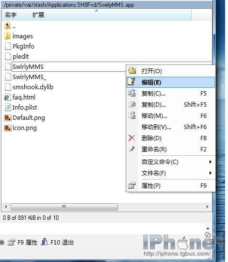 2、用Winscp進入iPhone上這個目錄內: /private/var/stash/Applications.SH8Fvd/SwirlyMMS.app,右鍵單擊文件swirlyMMS ,選擇“編輯”找到類似下面的內容,修改原來內容為下面內容: