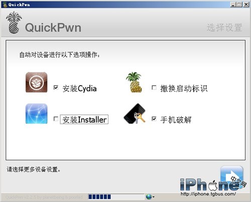 3.直接進入功能選擇界面了,這裡可以選擇是否安裝Cydia和Installer,可以選擇是否替換開機和恢復畫面,還可以選擇是否進行解鎖(只對1代iPhone起作用)。