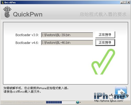 2.QuickPwn接下來會自動讀取你的固件版本,並在浏覽框下方用文字來提示。選擇成功後,設備圖片上會顯示一個綠色的大對勾。